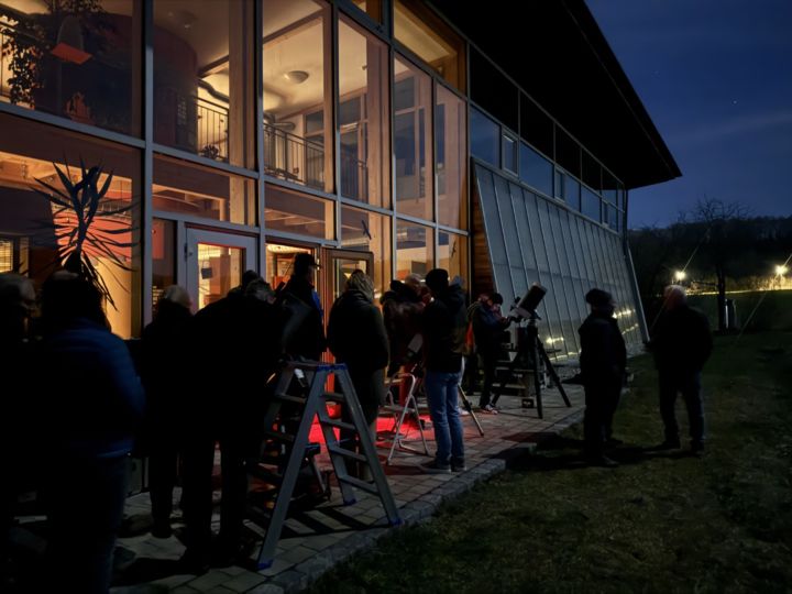 Im Anschluss an den Vortrag konnten die Besucherinnen und Besucher selbst aktiv werden. Bei klarem Himmel bot sich ein eindrucksvoller Blick durch die bereitgestellten Teleskope. Die Kraterlandschaft, Mare und Hochländer waren deutlich zu erkennen. Auch der „Goldene Henkel“ war an diesem Abend gut sichtbar. Dieses Phänomen entsteht am sogenannten Terminator, die Grenze zwischen Tag- und Nachtseite des Mondes, wenn der höher gelegene Kraterrand bereits von der Sonne beleuchtet wird und tiefere Bereiche noch im Schatten liegen.